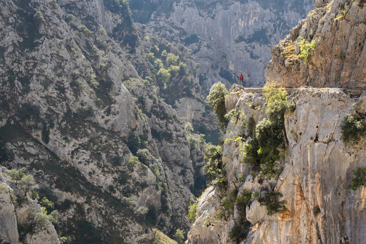 Een van de bekendste hikes in de Picos de Europa is de route langs de Cares rivier. Ik had verwacht dat je er langs de rivierbedding zou lopen en er misschien zelfs af en toe wel in kon springen om af te koelen. Maar het pad liep op hoogte in de volle zon. Het eerste gedeelte was ook nog eens ongeveer 2 kilometer lang, vrij stijl omhoog. Mijn shirt kon je uitwringen, ik zweette als een otter. Het was wel mooi hoor maar anders dan ik me had voorgesteld. Verderop was het pad ineens afgezet vanwege vallend puin. We liepen, net als alle andere toeristen, toch nog een stukje door, maar heel relaxed loop je daar dan ook niet. Je zag inderdaad overal verse stenen op het pad liggen. We besloten om terug te gaan en op zoek te gaan naar een plek waar we af konden koelen.